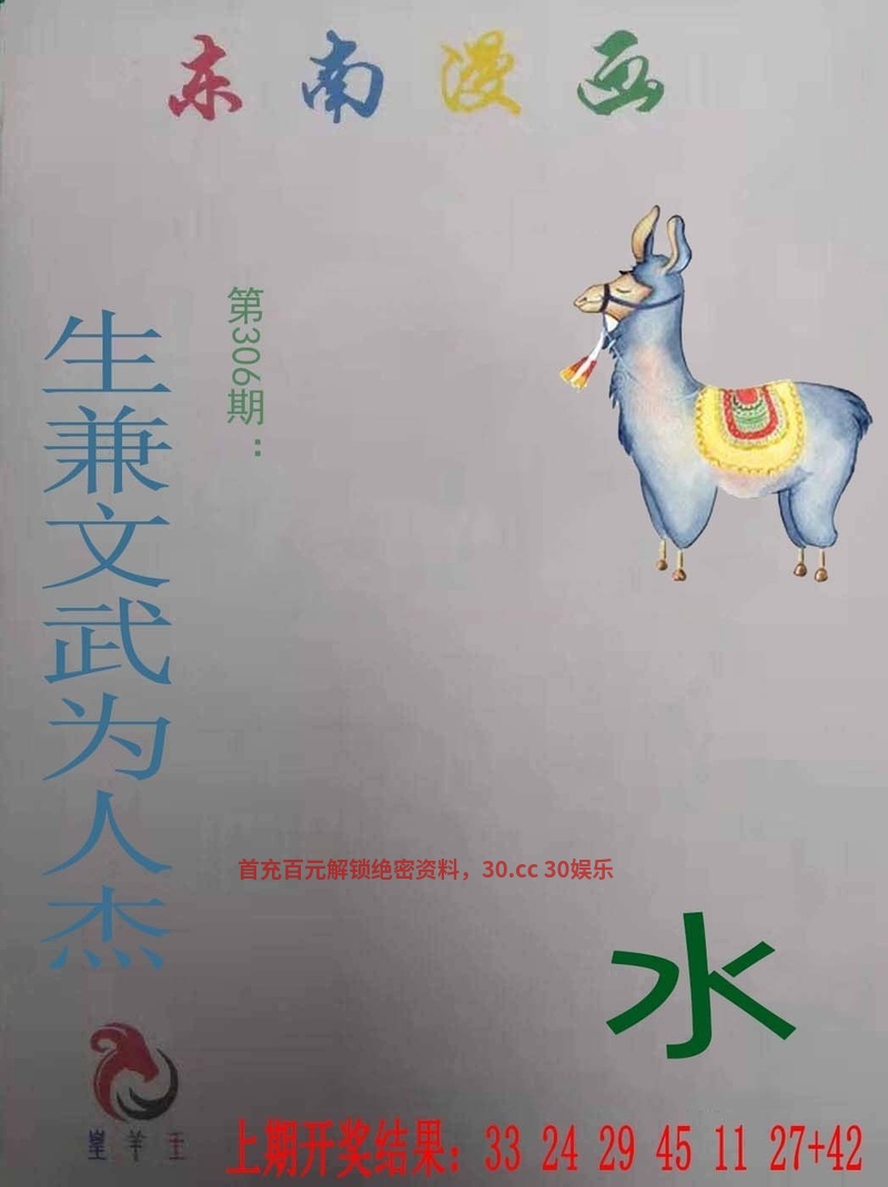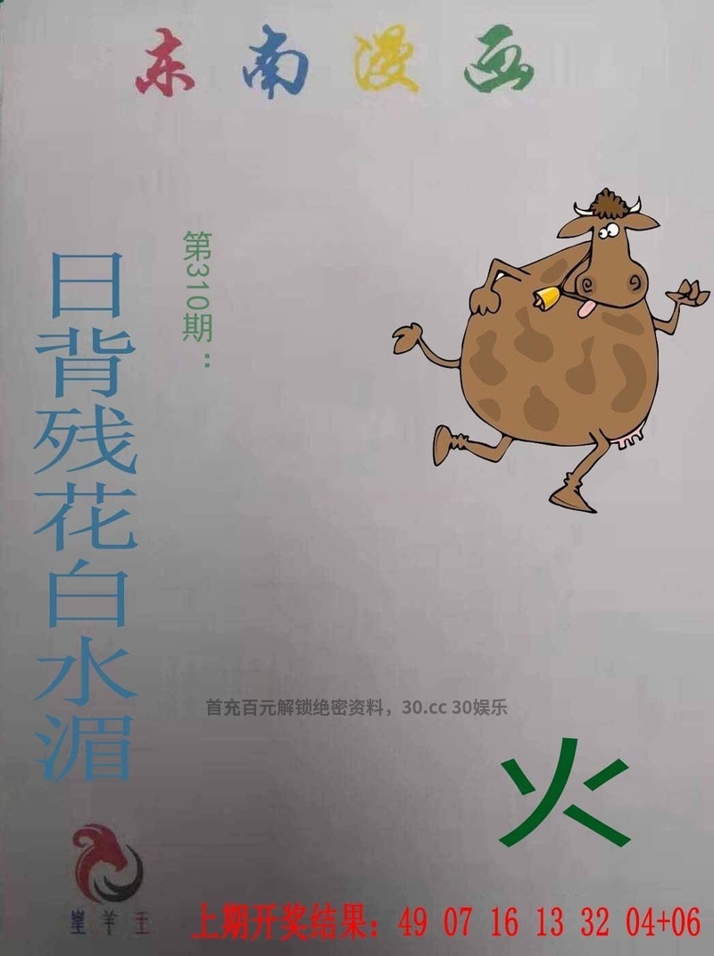 307期:今期生肖一二开,老牛骑马倒着走。十有八九输在此,一句鬼话说前头。龙王落水取灵码,一三四二三合到。佳成一唱好才文,鲜鱼只愿水中养。