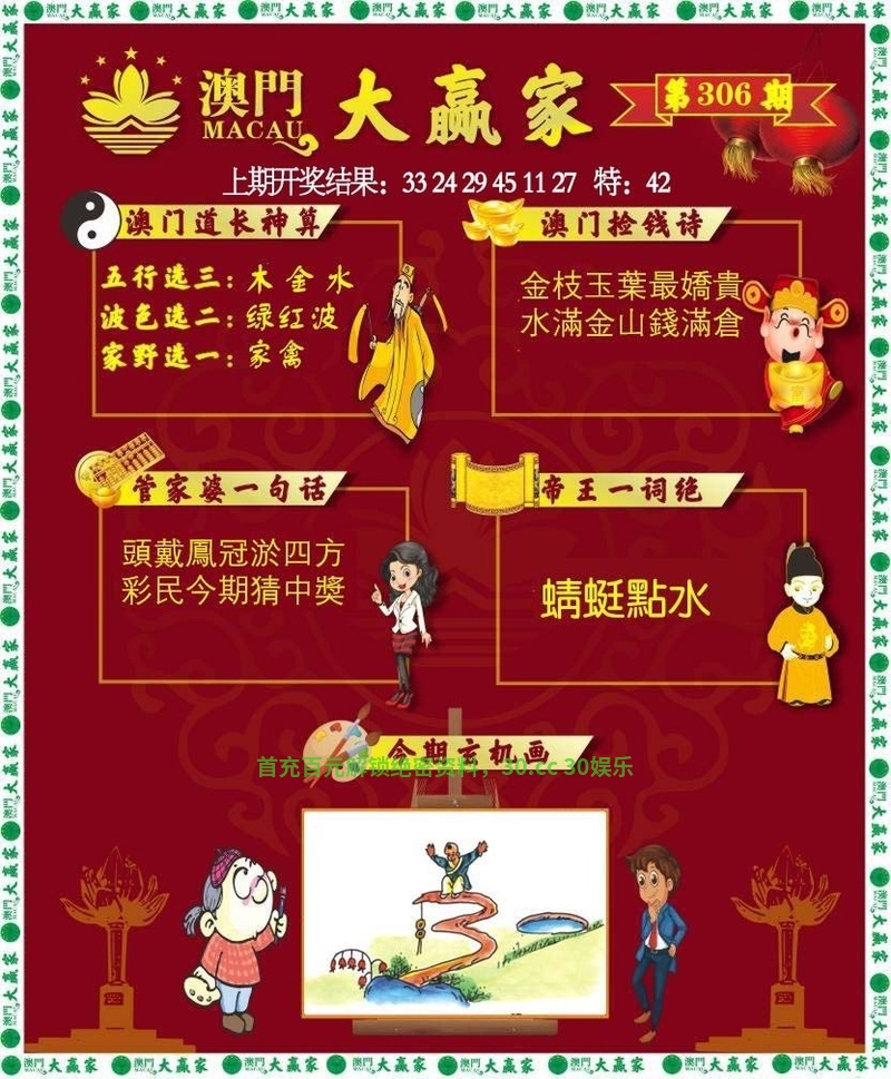 308期:今期生肖二七开,老牛骑马倒着走。十二生肖我老大,一轮红日照天涯。三七开来合数双,江鲤也想跃龙门。花香鸟语成双对,金银财宝随手拿。