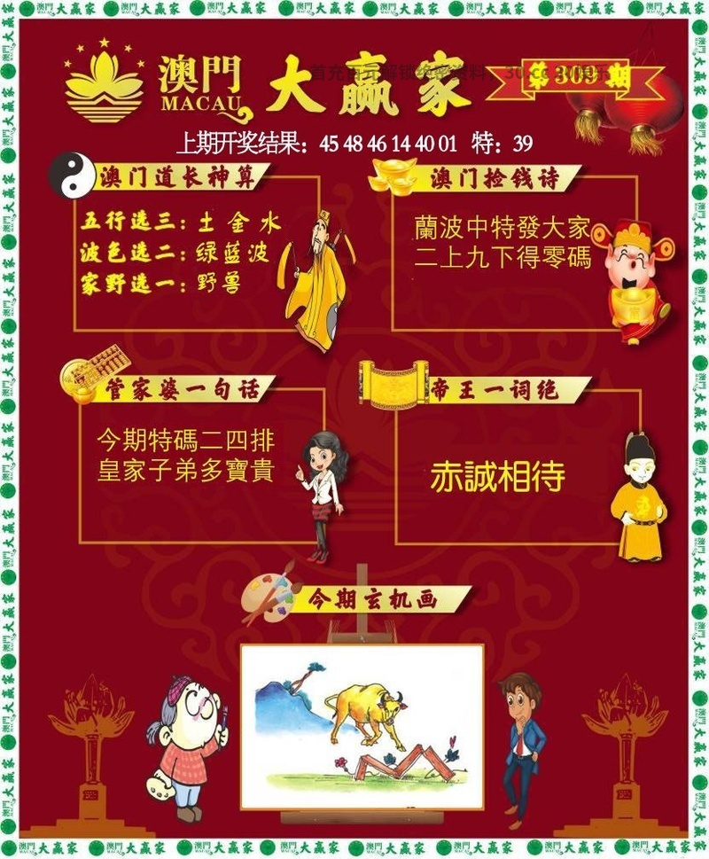 309期:今期生肖三五开,武松打虎世人传。道人本期点灵码,二三合成五六码。元宵十五好佳节,农夫家里出千金。是龙是凤自己查,一三全四中本期。